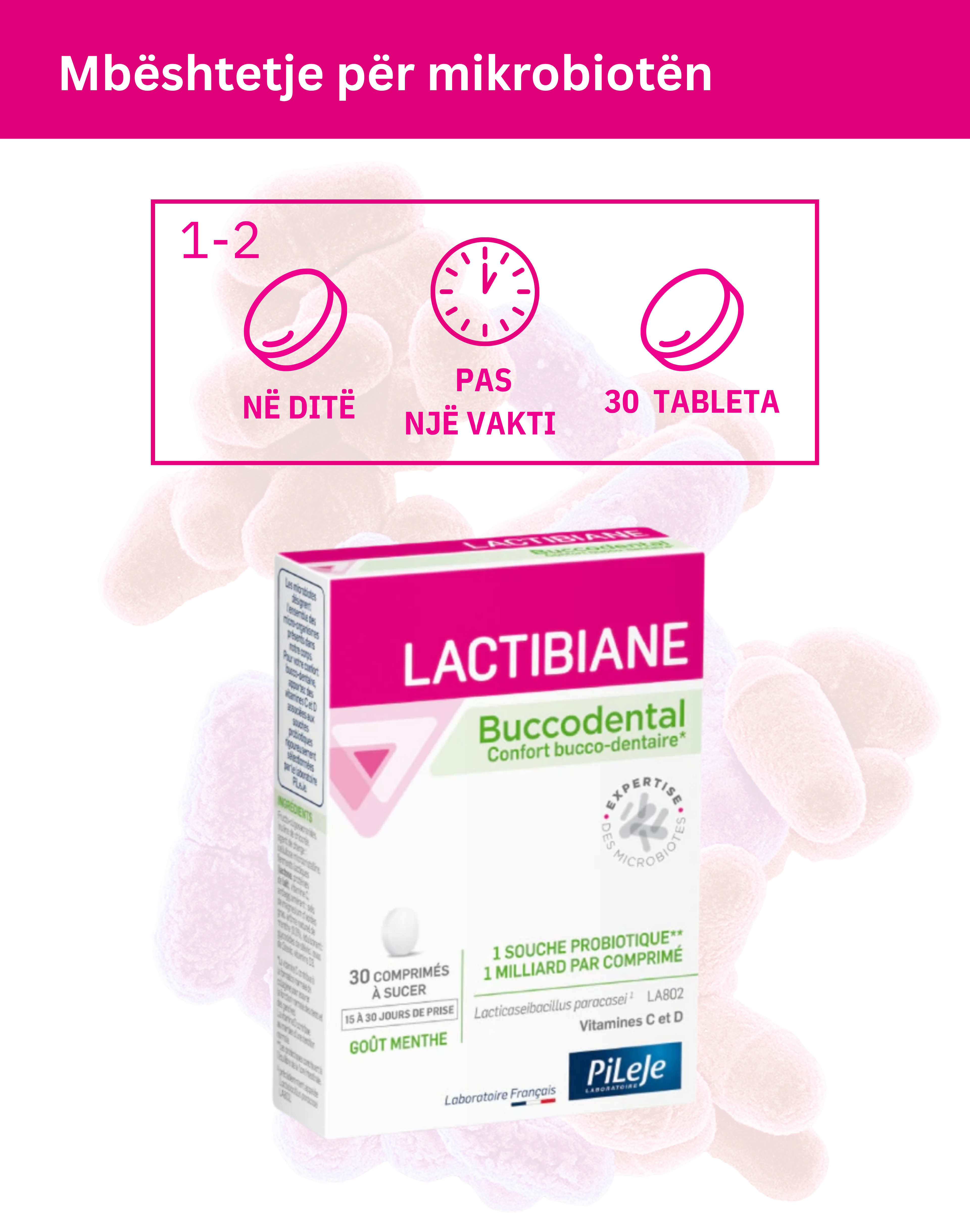 Lactibiane Buccodental është formuluar për të kontribuar në ekuilibrin e mikrobiotës orale dhe në mirëmbajtjen e shëndetit të dhëmbëve dhe mishrave. Formula kombinon një shtam probiotik të studiuar për zgavrën orale me vitamina thelbësore që mbështesin strukturën dentare dhe indet periodontale. Tabletat e tretshme në gojë veprojnë lokalisht në zgavrën e gojës.